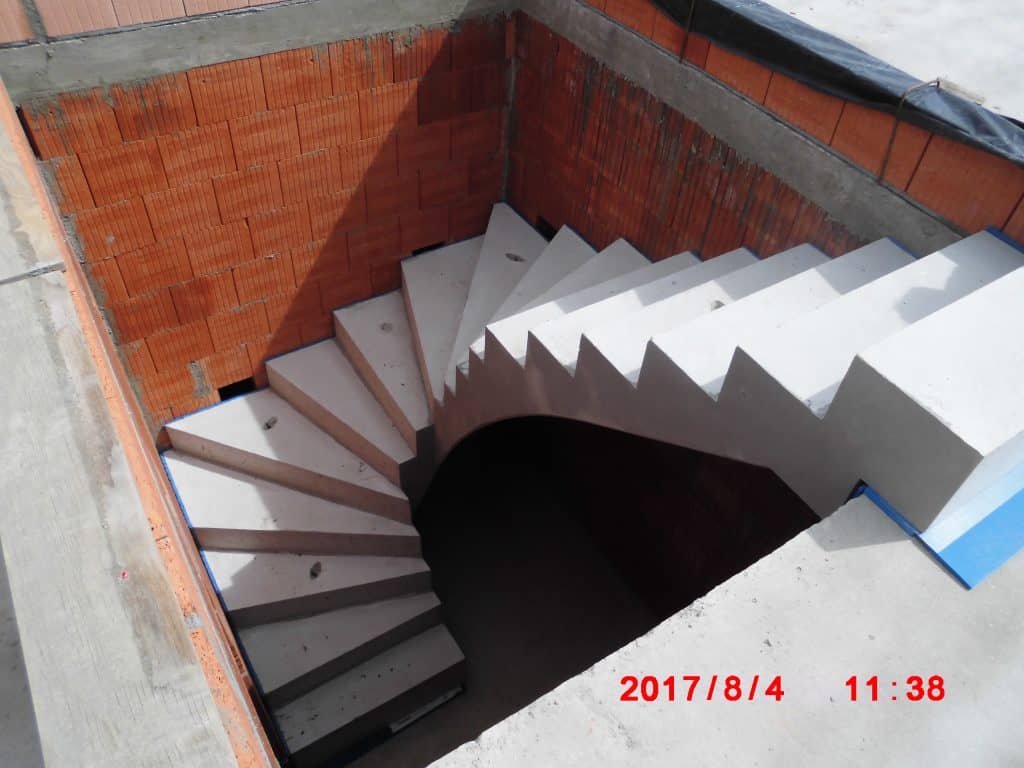 Außenmauerwerk aus Poroton S9, d = 42,5 cm, mit integrierter Perlitdämmung. Da dieses während der Bauphase nicht nass werden durfte, mussten die Mauerwerkskronen der Außenwände täglich vor Feuchtigkeit geschützt und zum Feierabend abgedeckt werden.