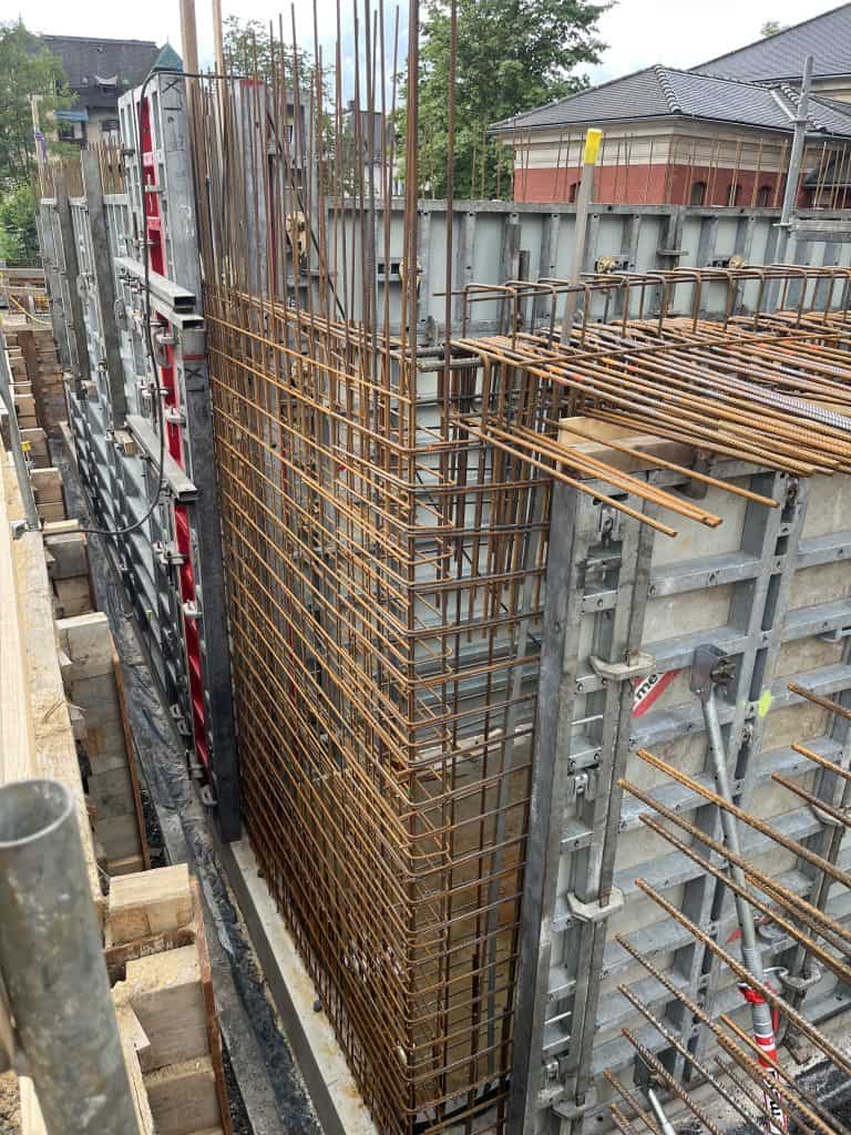 Die Ausführung erfolgte unter stark beengten Platzverhältnissen unmittelbar an der Max-Müller-Straße. Im Kellergeschoss stand straßenseitig lediglich ein Arbeitsraum von 1,00 m bis zum Bohlenverbau zur Verfügung.