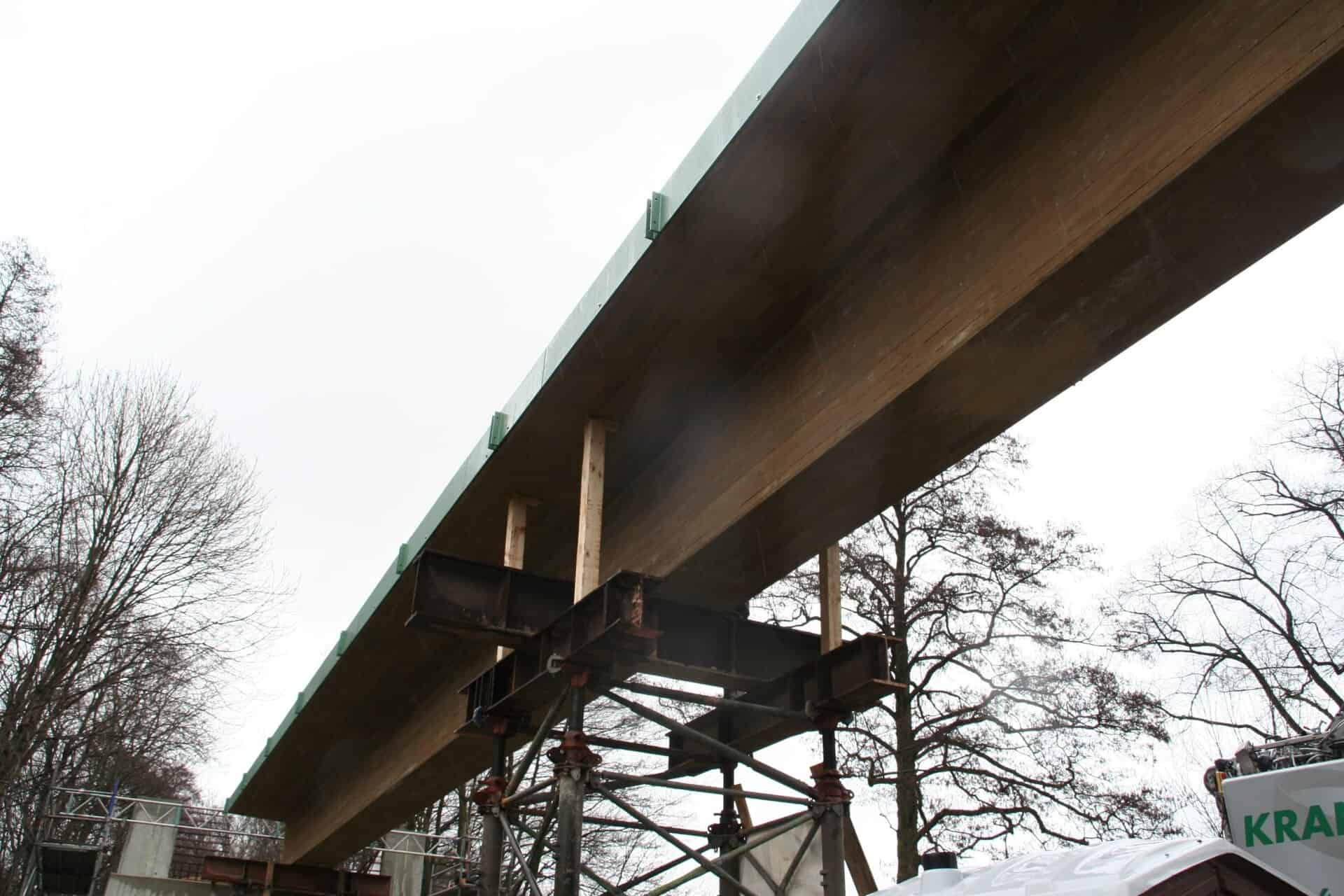 Der Umbau erfolgte durch Teilrückbau und Erhöhung der bestehenden Widerlager, sowie Neubau von Stützwänden teilweise mit Natursteinverblendung. Um die Ausführungszeit zu verkürzen, wurde der Brückenträger als Halbfertigteil (100 t) vorgefertigt und vor Ort montiert. Die Endquerträger und die Fahrbahn wurden anschließend vor Ort mit eingefärbtem, hochfestem Beton gegossen. Die Stabilität erhält die Brücke durch Spannbetonbauweise im sofortigen Verbund und mit nachträglicher Vorspannung. Abschließend wurde ein Stahlfachwerk mit Edelstahlnetzen montiert, um die Charakteristik der alten Eisenbahnbrücke beizubehalten.